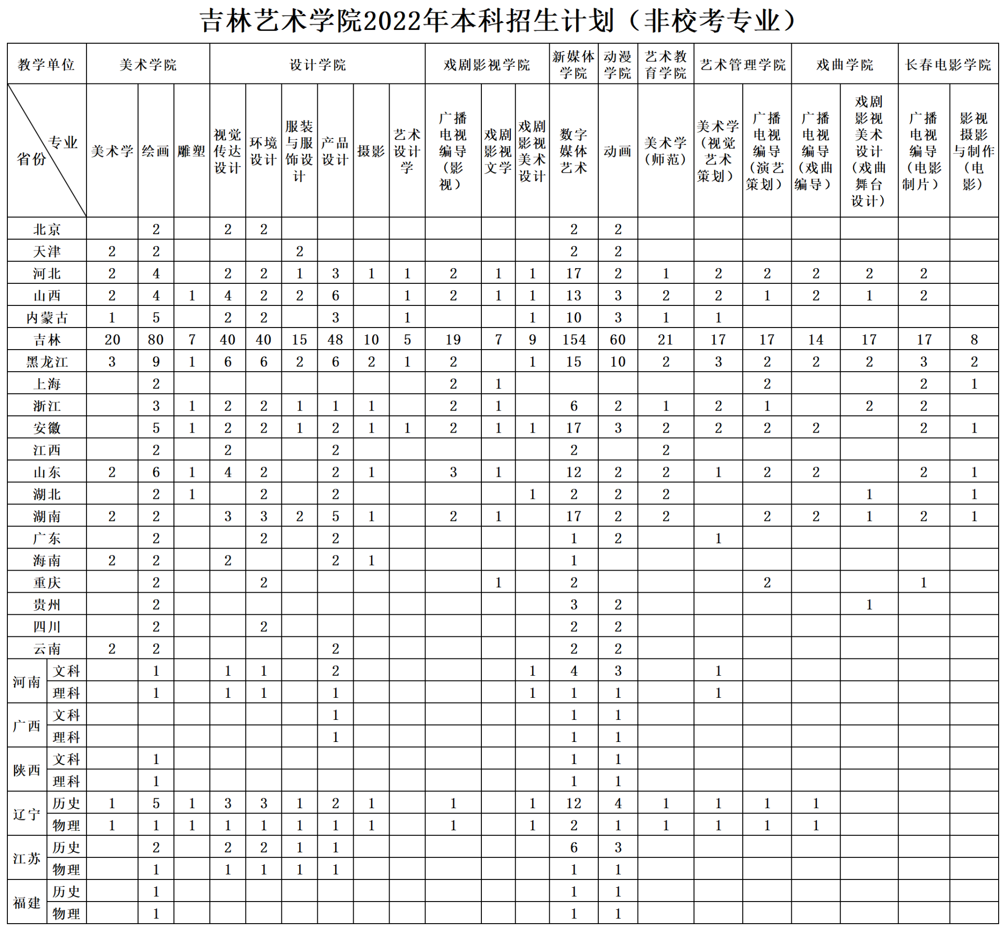 吉林艺术学院2022年本科招生计划(非校考专业)