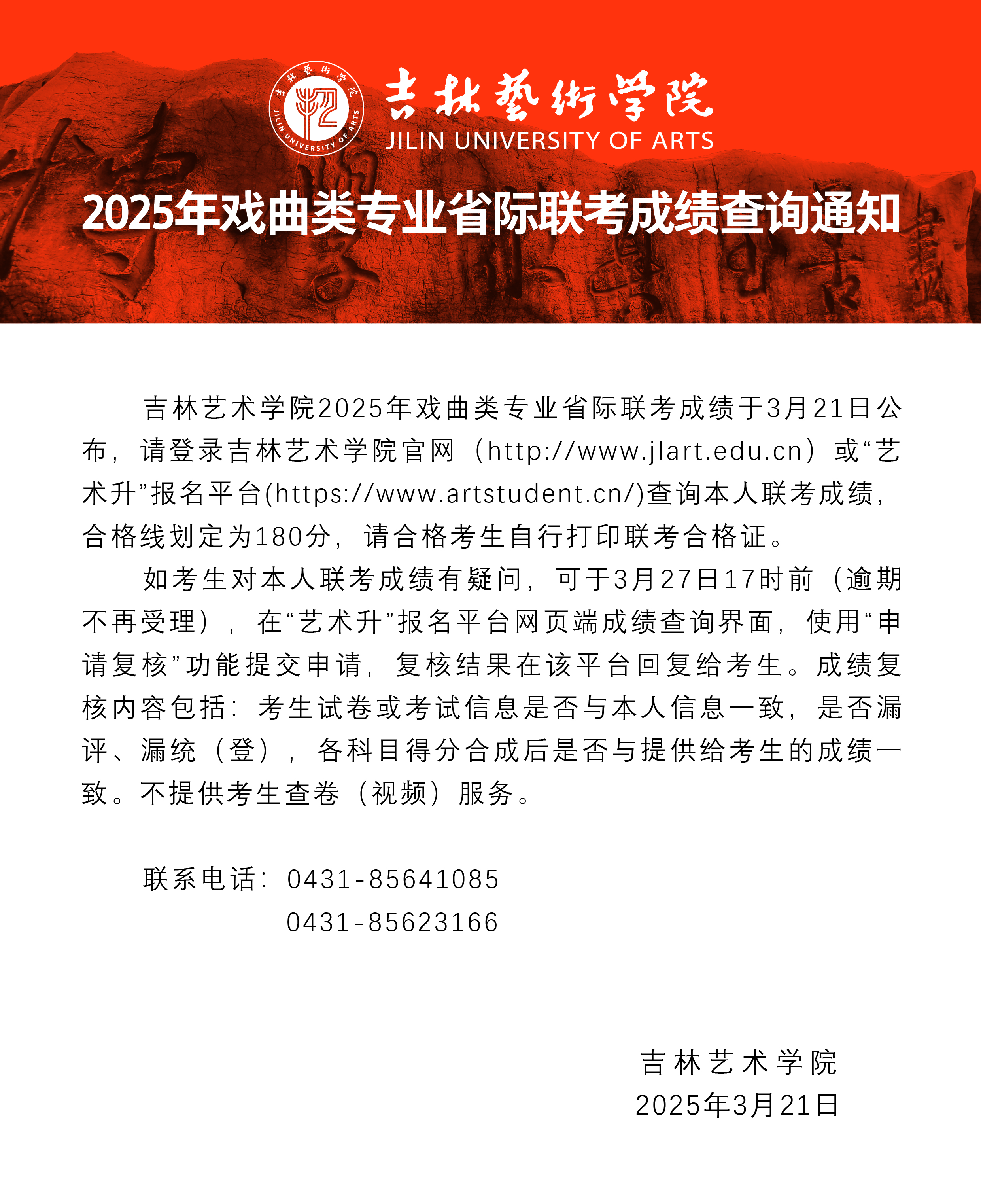 吉林艺术学院2025年戏曲类专业省际联考成绩查询通知