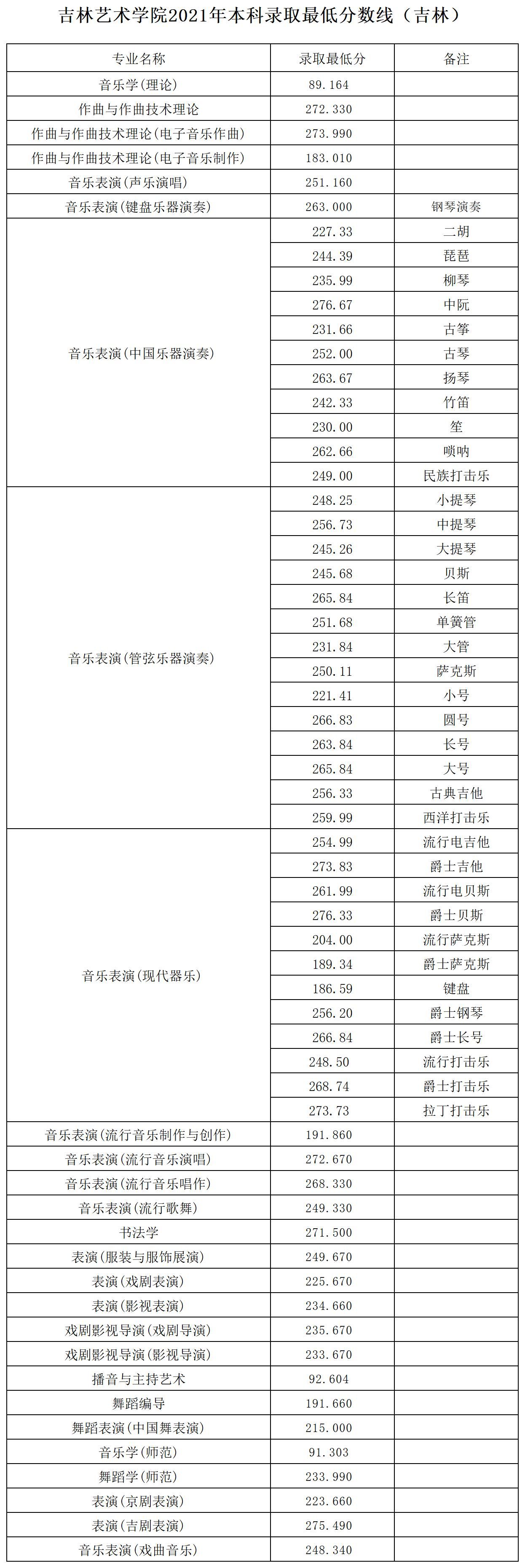 吉林艺术学院2021年本科录取最低分数线(吉林)