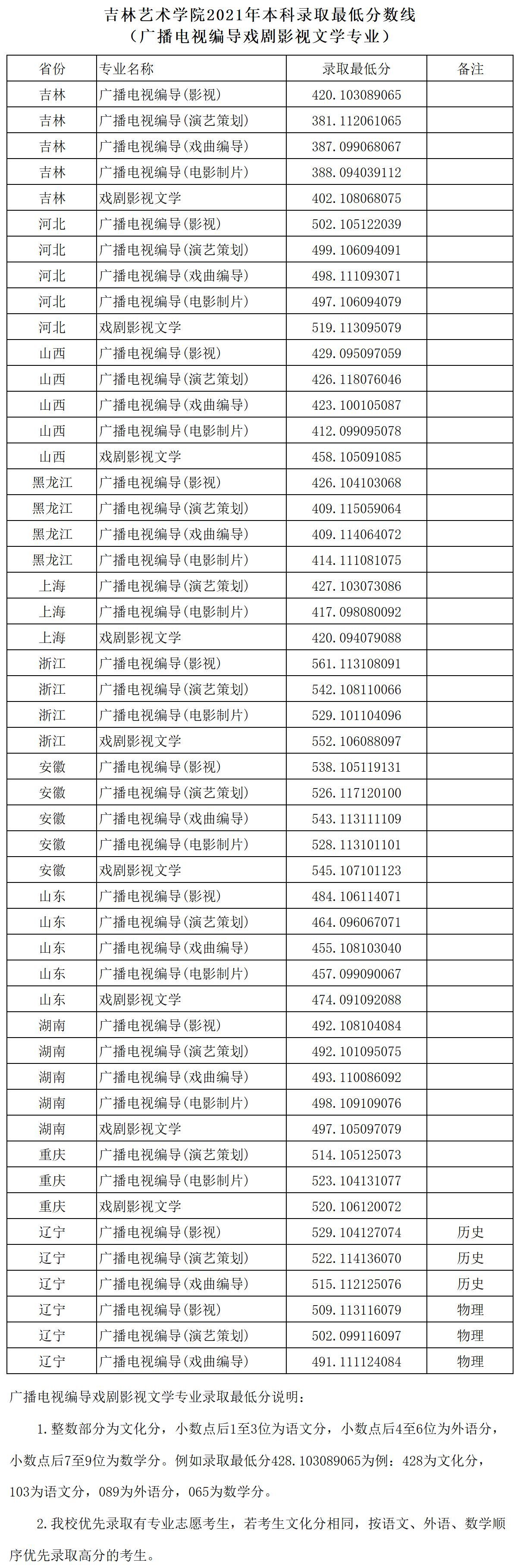 吉林艺术学院2021年本科录取最低分数线(广播电视编导戏剧影视文学专业)