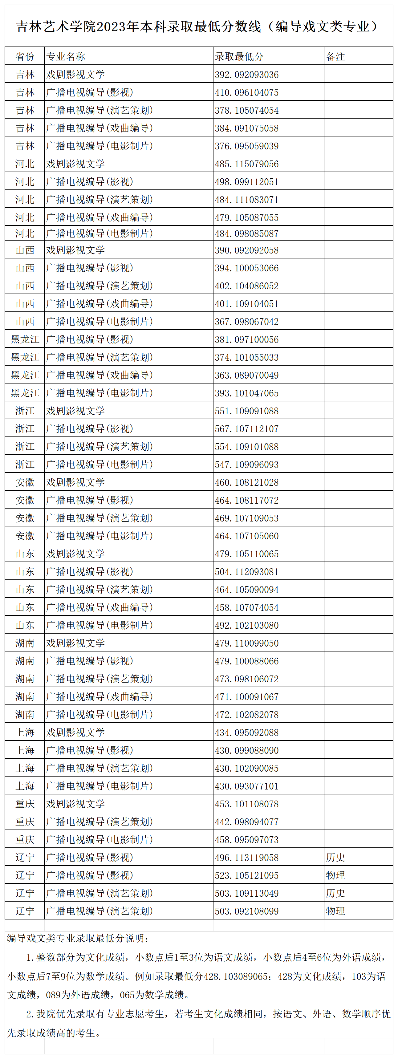 吉林艺术学院2023年本科录取最低分数线(编导戏文类专业)