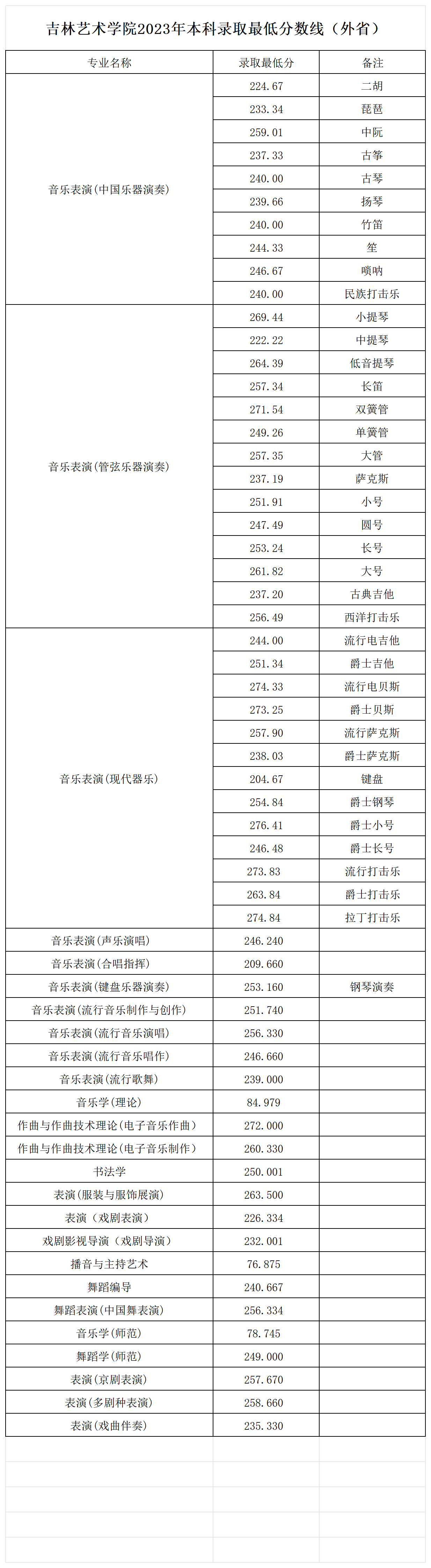 吉林艺术学院2023年本科录取最低分数线(外省)