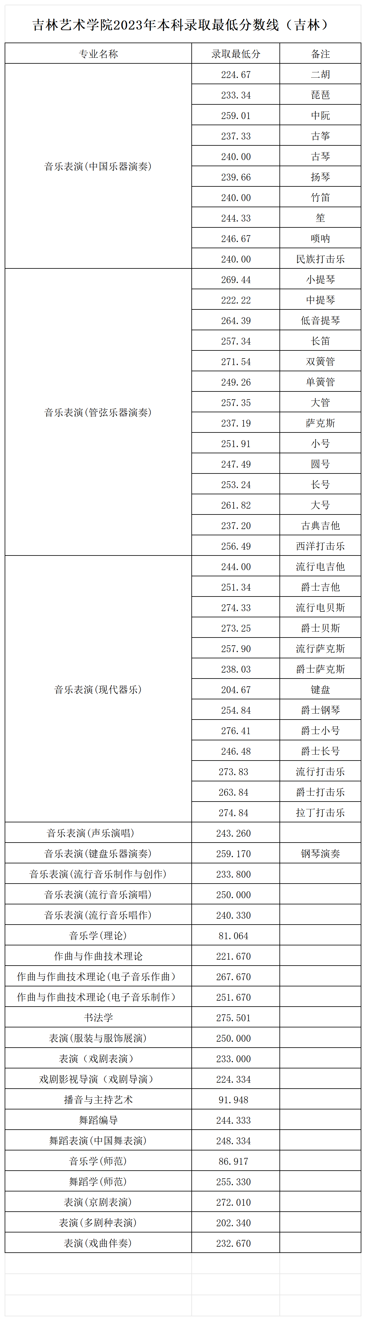吉林艺术学院2023年本科录取最低分数线(吉林)