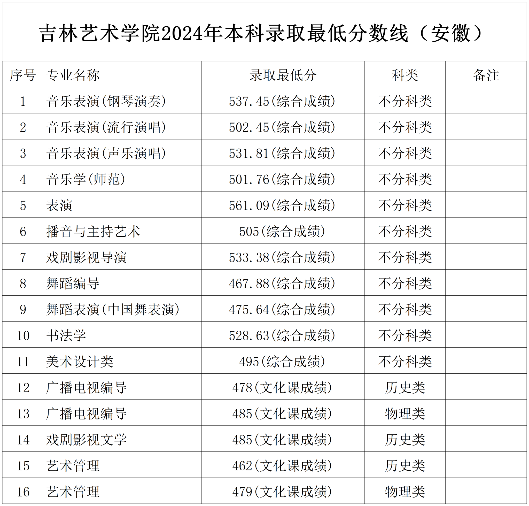 吉林艺术学院2024年本科录取最低分数线(安徽)