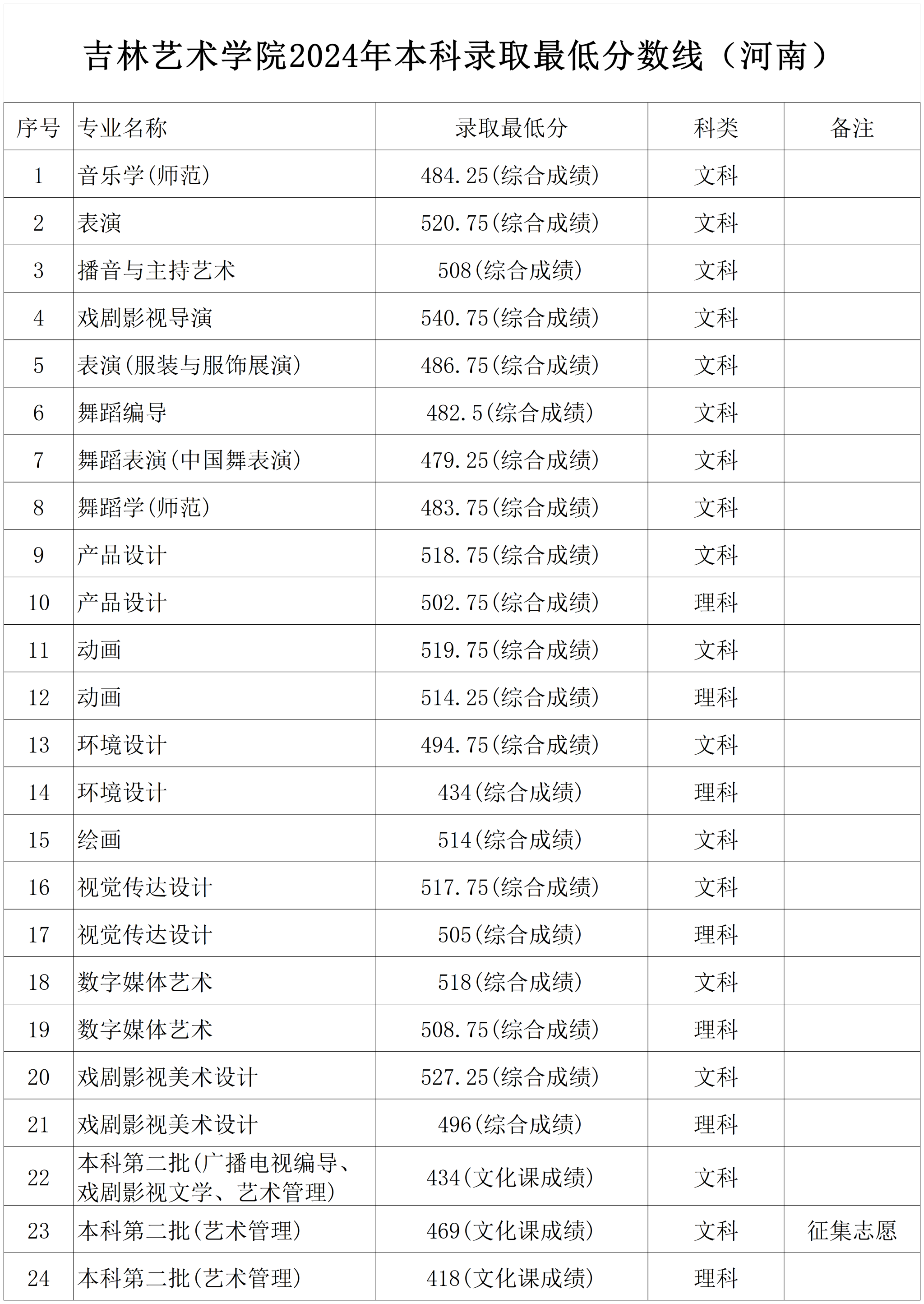 吉林艺术学院2024年本科录取最低分数线(河南)