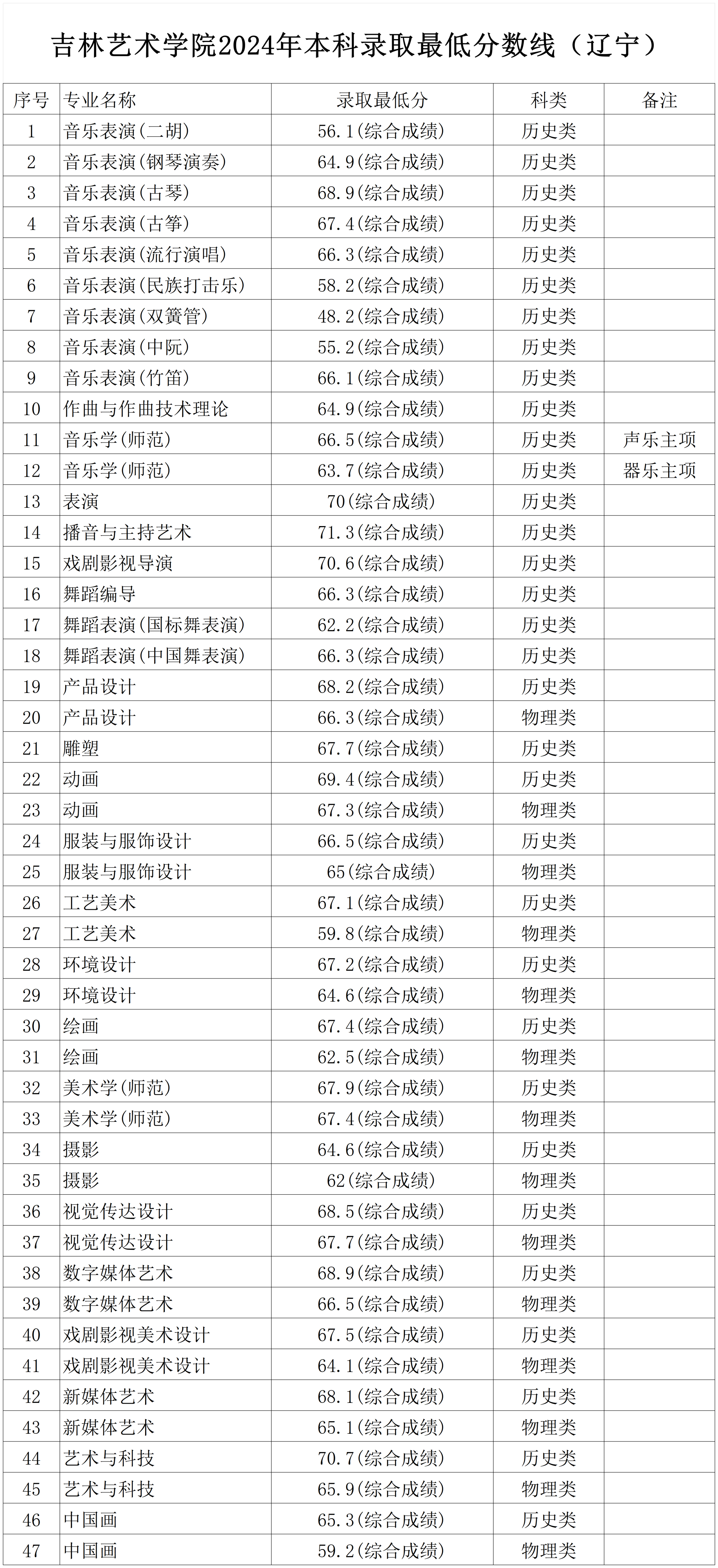 吉林艺术学院2024年本科录取最低分数线(辽宁)