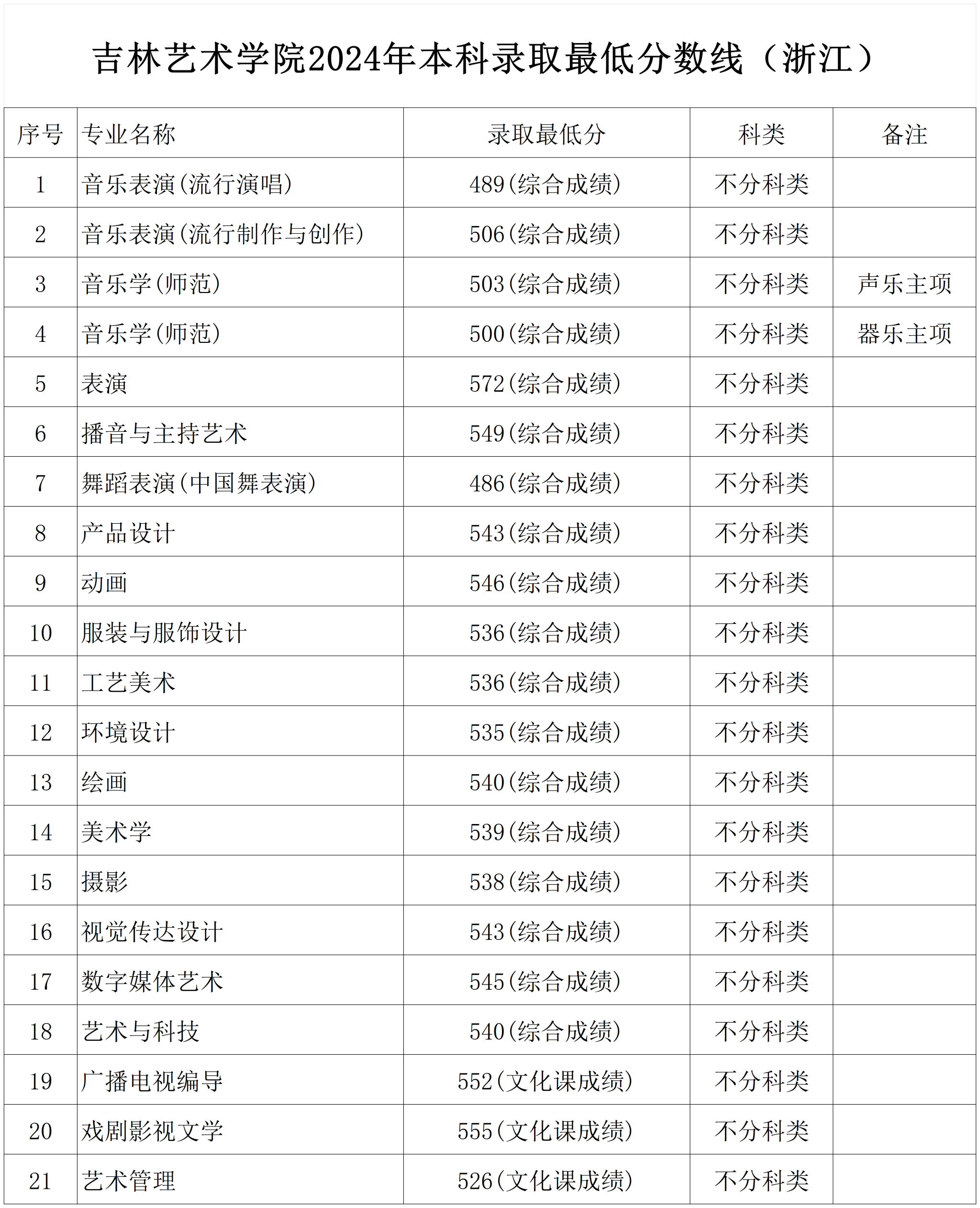 吉林艺术学院2024年本科录取最低分数线(浙江)