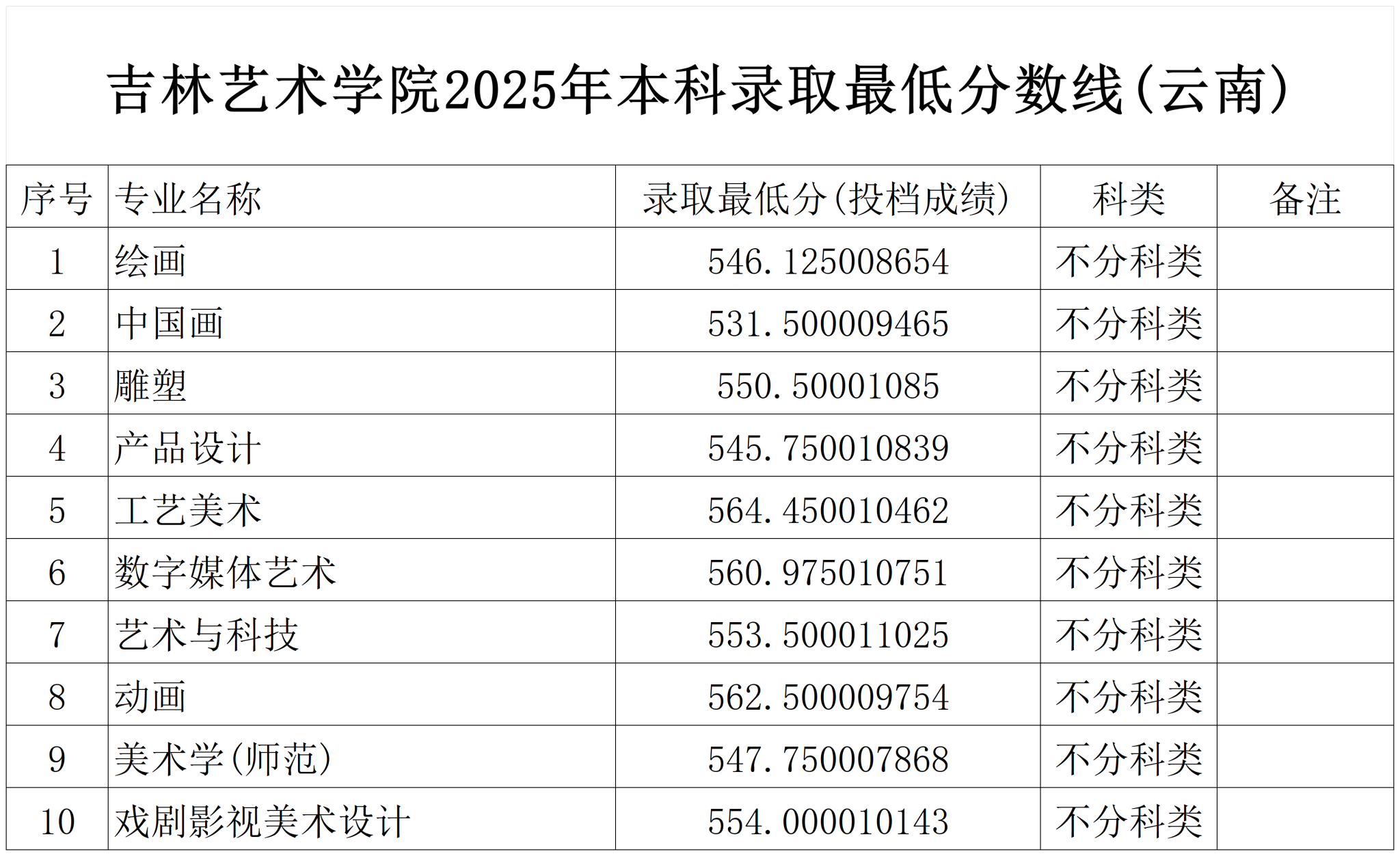 吉林艺术学院2025年本科录取最低分数线(云南)