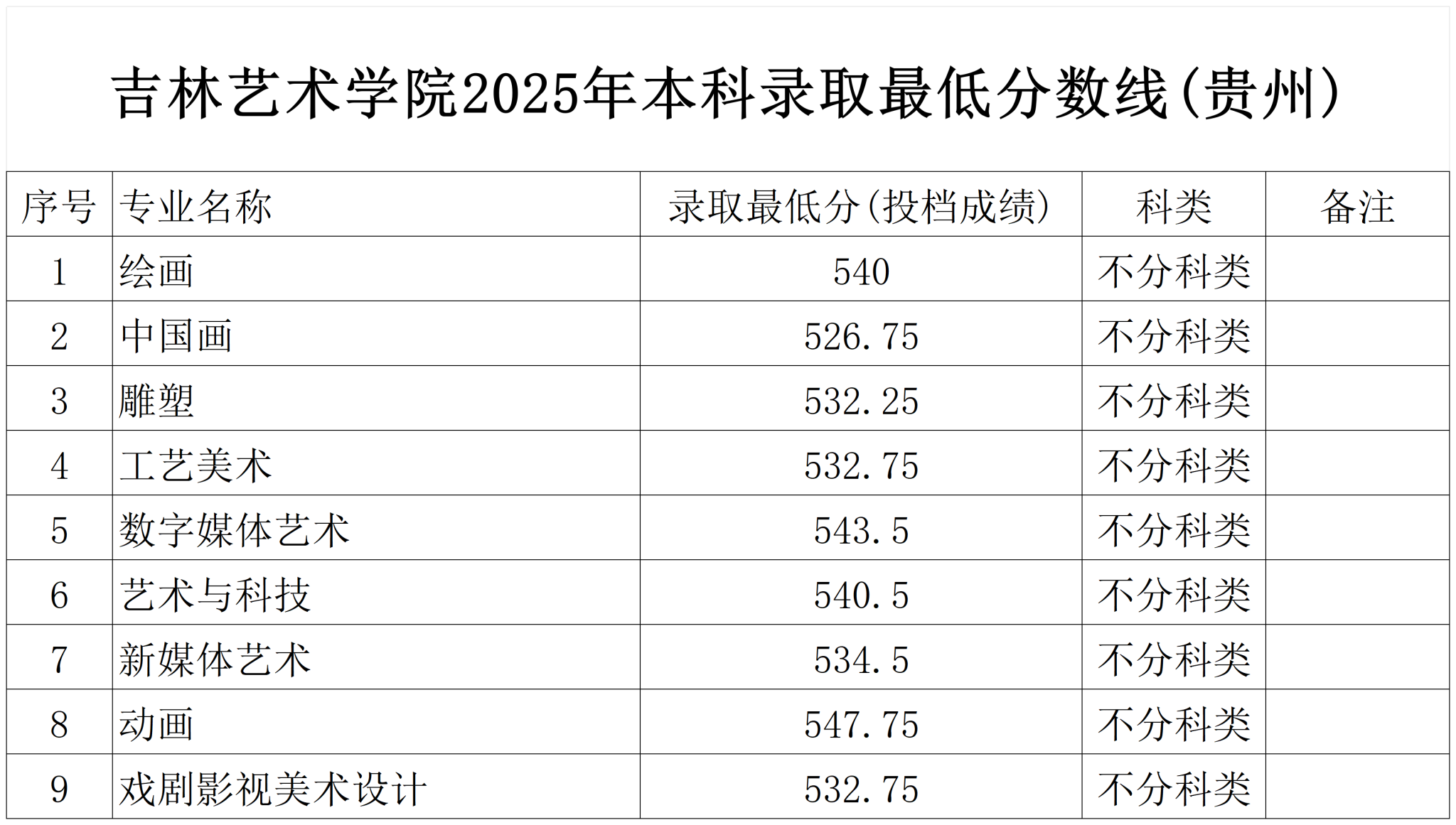 吉林艺术学院2025年本科录取最低分数线(贵州)