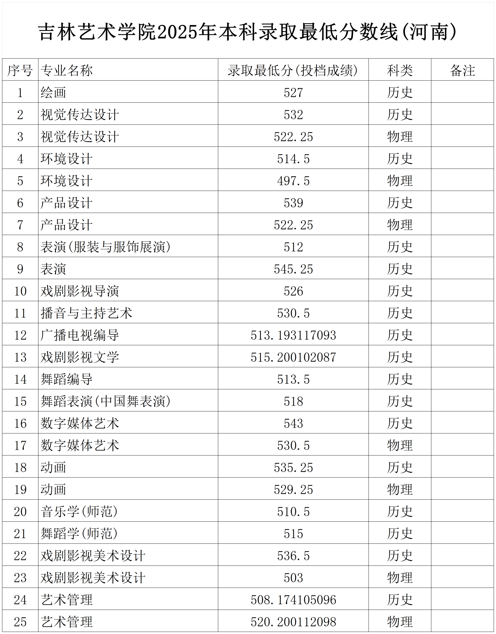吉林艺术学院2025年本科录取最低分数线(河南)