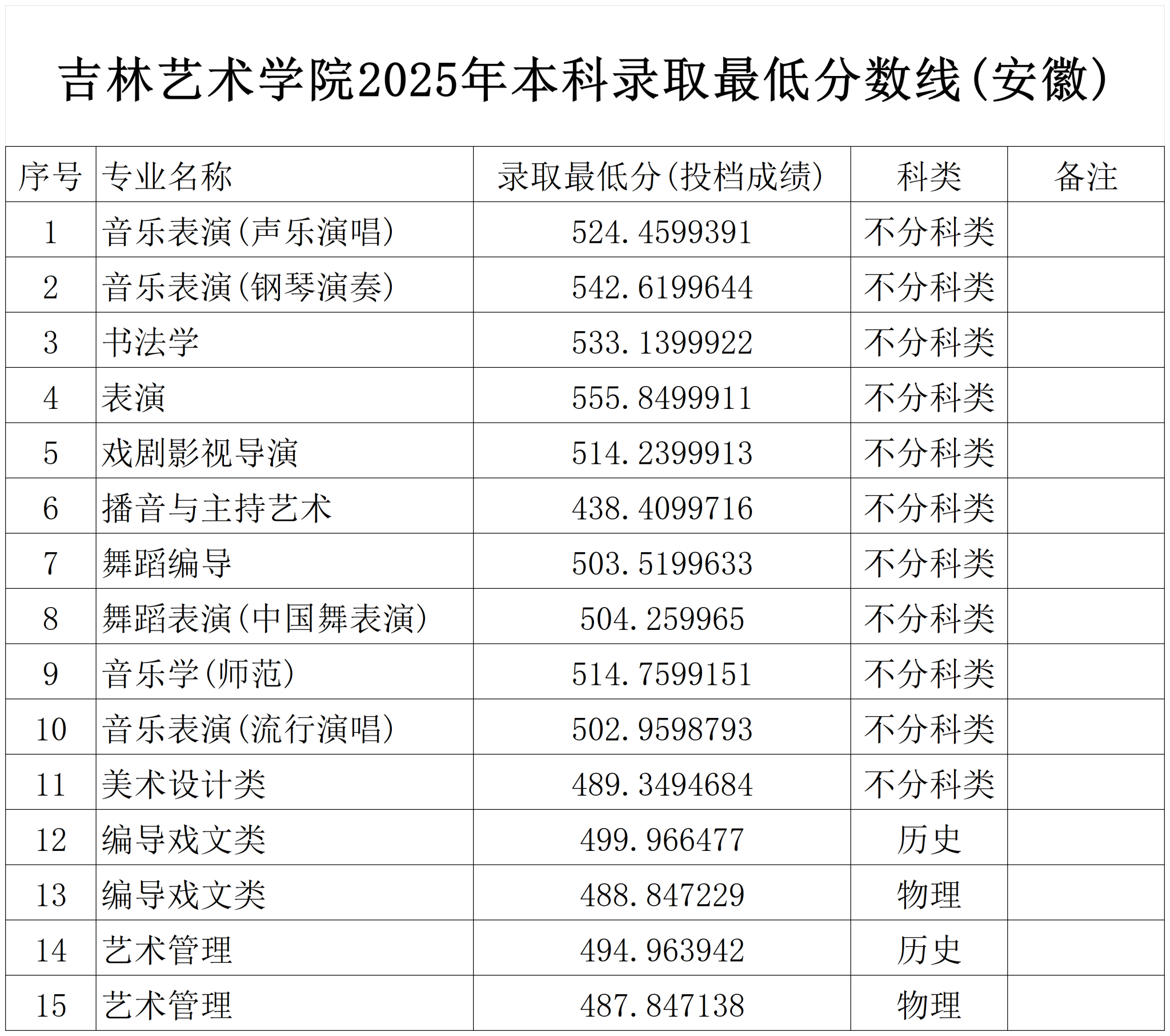 吉林艺术学院2025年本科录取最低分数线(安徽)