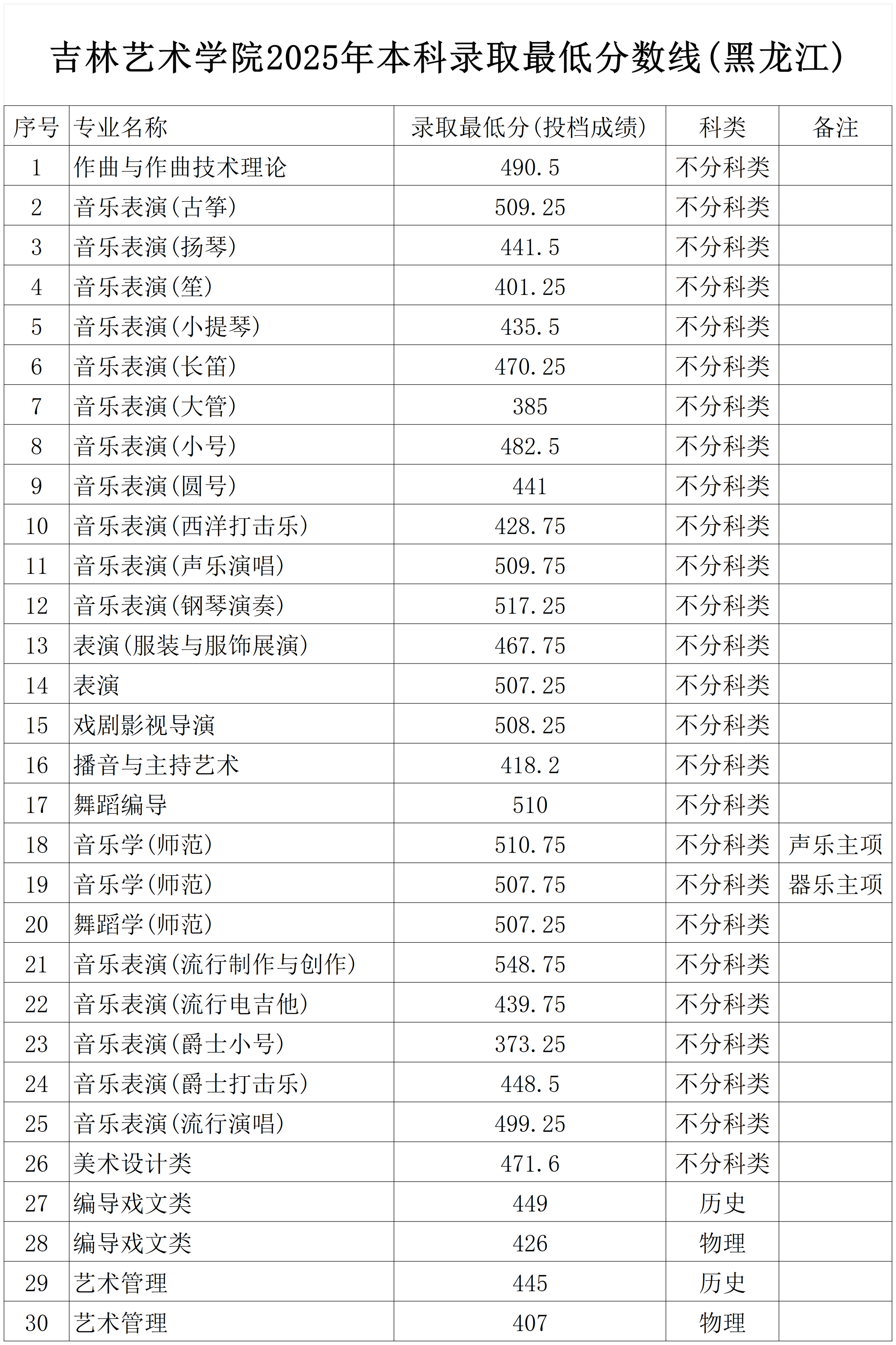 吉林艺术学院2025年本科录取最低分数线(黑龙江)
